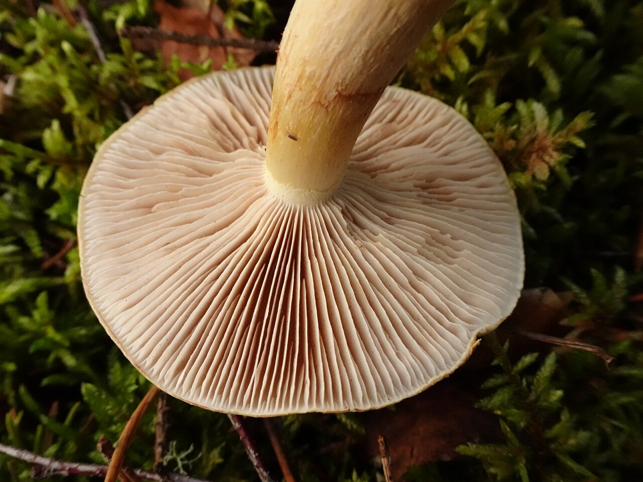 The cap of C. triumphans ranges from 5-15cm in diameter and is convex to flat, with a smooth and sometimes sticky surface. Its stem is usually about 5-10cm long and is tough and fibrous. The stem and flesh of this mushroom often exhibit a yellow staining reaction when handled or cut. The gills are initially pale yellowish-white, but become rusty brown as the mushroom matures. The spore print of C. triumphans is rusty brown, and the spores themselves are elliptical and ornamented with small bumps, typically measuring 8-10µm in length.