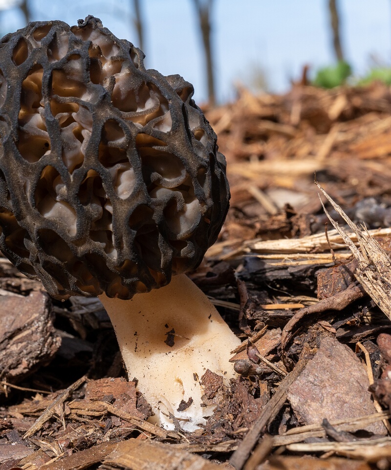 The fruiting bodies of Morchellaceae fungi typically appear in the spring, often after periods of rain or snowmelt. They are commonly found in forests, especially in disturbed areas, such as burned sites or areas with nutrient-rich soil.